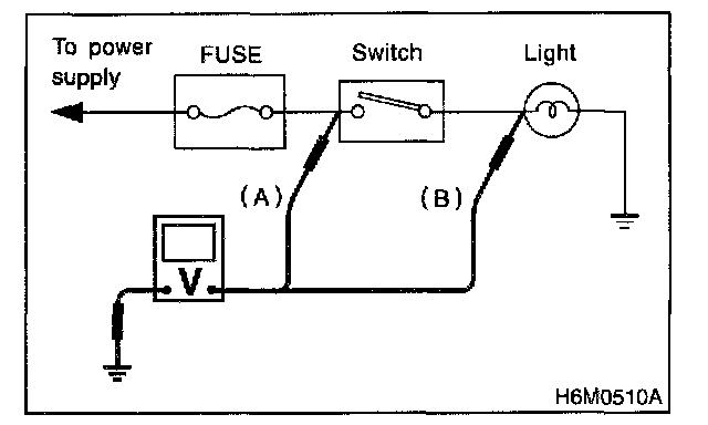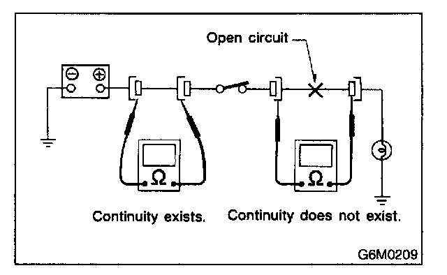 Disconnect all connectors affected, and check continuity in the wiring between adjacent connectors. When the ohmmeter indicates "infinite", the wiring is open.
