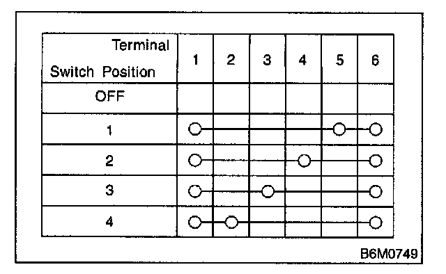 3. Symbol in the table indicates that continuity exists between two points or terminals. For example, when a switch position is "3", continuity exists among terminals 1, 3 and 6, as shown in table.