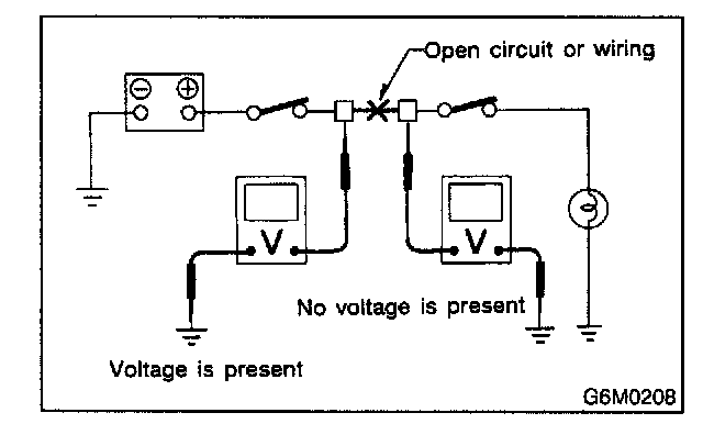 An open circuit is determined by measuring the voltage between respective connectors and ground using a voltmeter, starting with the connector closest to the power supply. The power supply must be turned ON so that current flows in the circuit. If voltage is not present between a particular connector and ground, the circuit between that connector and the previous connector is open.