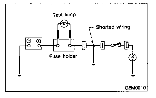 Connect a test lamp (rated at approximately 3 watts) in place of the blown fuse and allow current to flow through the circuit. Disconnect one connector at a time from the circuit, starting with the one located farthest from the power supply. If the test lamp goes out when a connector is disconnected, the wiring between that connection and the next connector (farther from the power supply) is shorted.