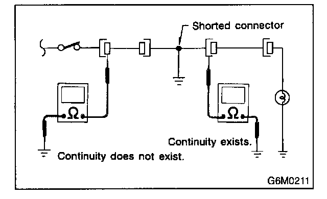 Disconnect all affected connectors, and check continuity between each connector and ground. When ohmmeter indicates continuity between a particular connector and ground, that connector is shorted.
