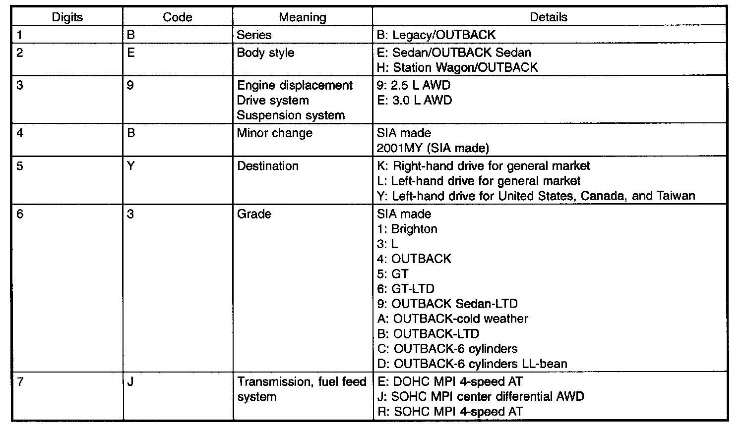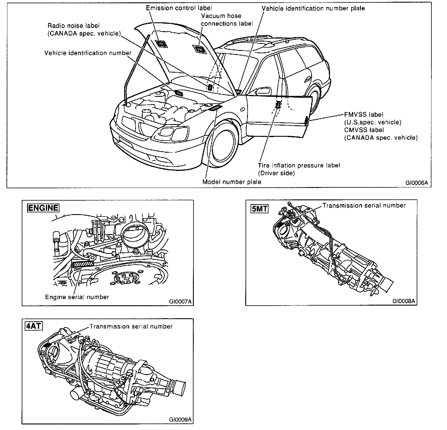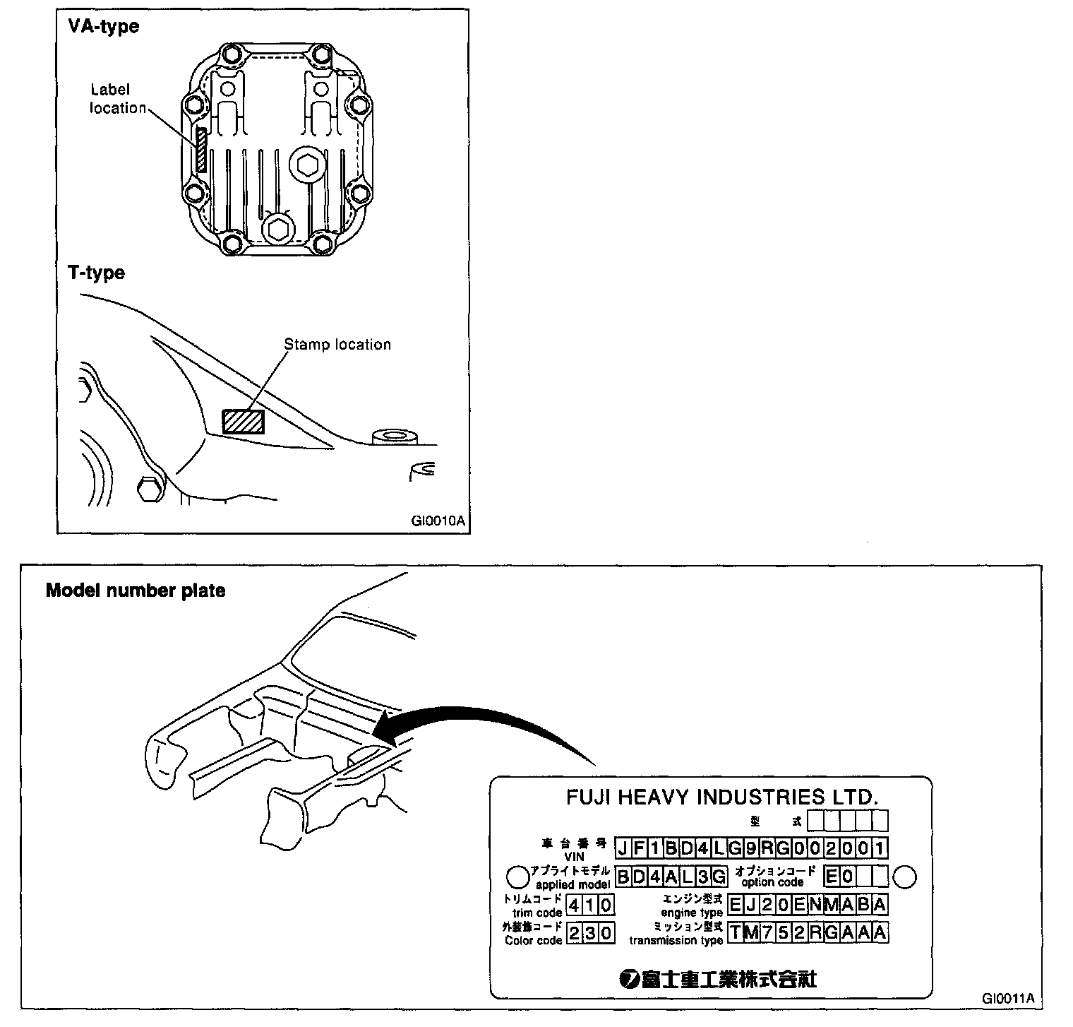 The model number plate indicates: the applied model, the option code, the trim code, the engine type, the transmission type, and the exterior color code. This information is helpful when placing orders for parts.