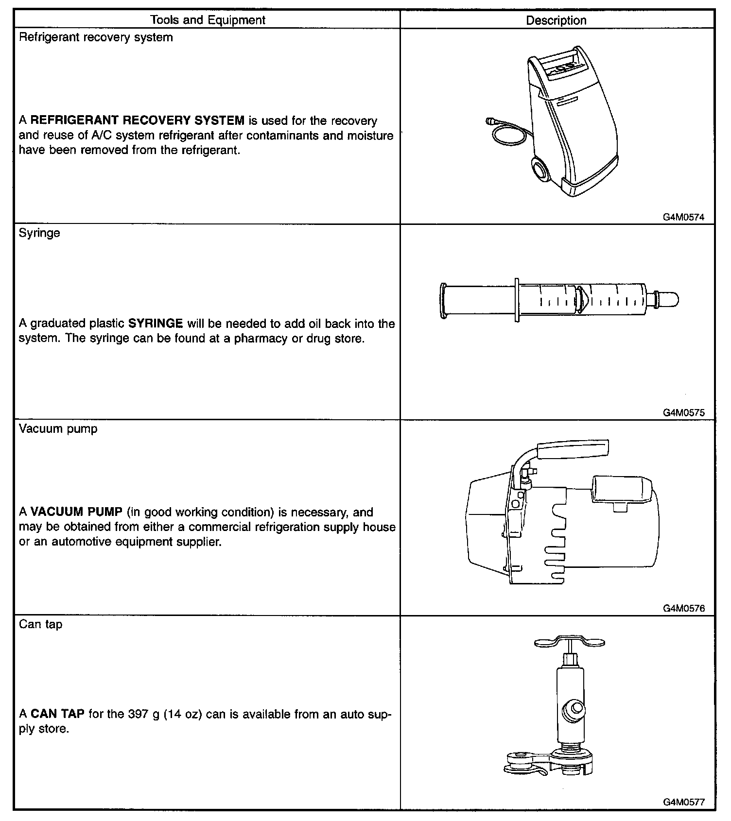 CAUTION: When working on vehicles with the HFC-134a system, only use HFC-134a specified tools and parts. Do not mix with CFC-12 tools and parts. If HFC-134a and CFC-12 refrigerant or compressor oil is mixed, poor lubrication will result and the compressor itself may be destroyed.