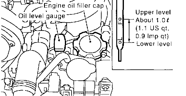 6. Just after driving or while the engine is warm, engine oil level may show in the range between the "F" line and the notch mark. This is caused by thermal expansion of the engine oil.