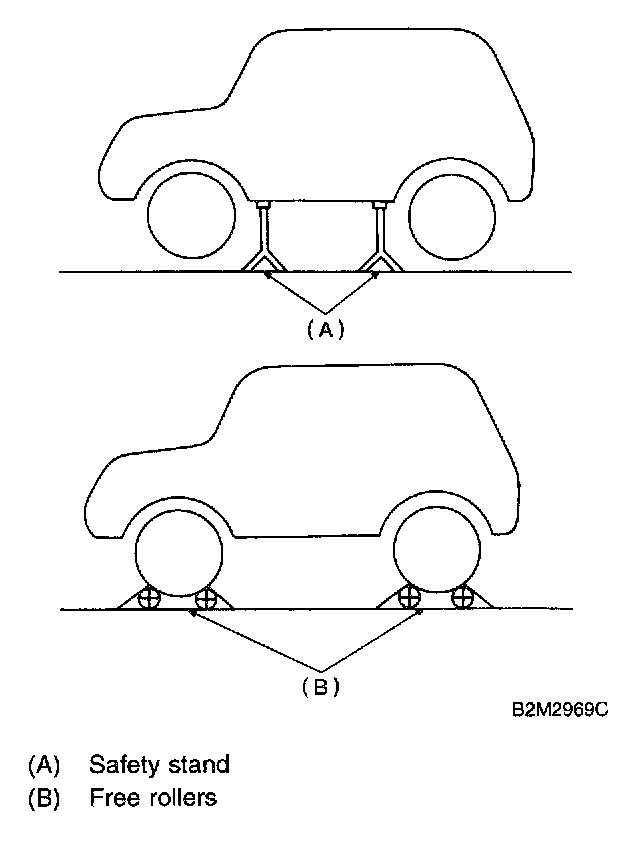 ^ In order to prevent the vehicle from slipping due to vibration, do not place any wooden blocks or similar items between the safety stands and the vehicle.