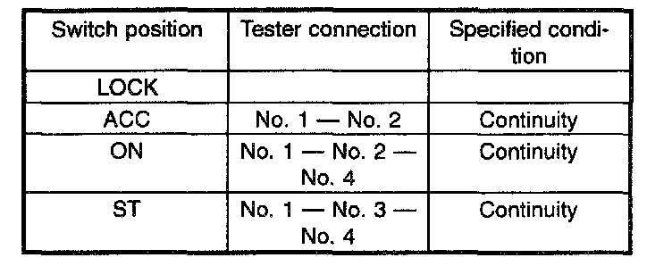 4. Turn the ignition key plate to each position and check the continuity between the terminals of the ignition connector.