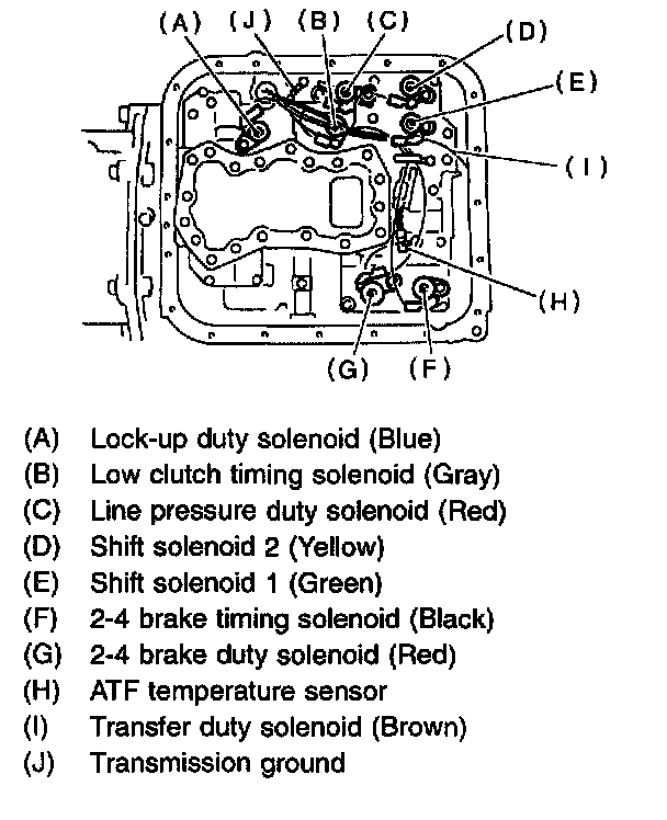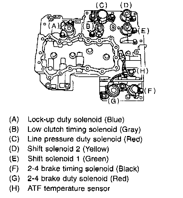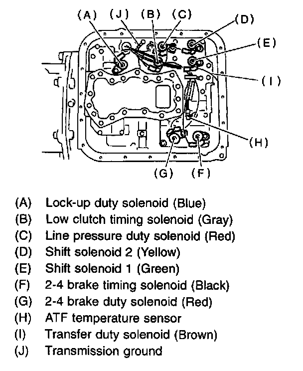 12) Disconnect the harness connectors for the solenoids, duty solenoids, ATF temperature sensor and the ground cord.
