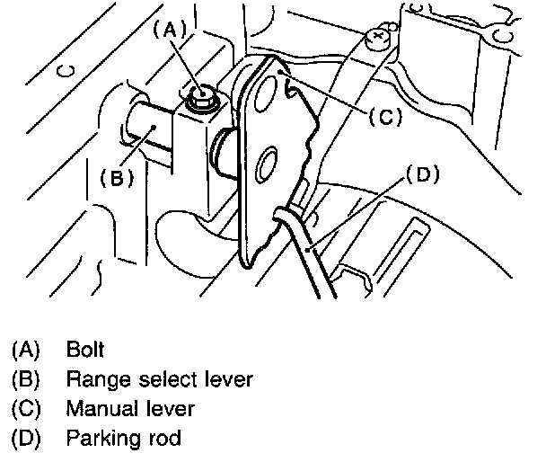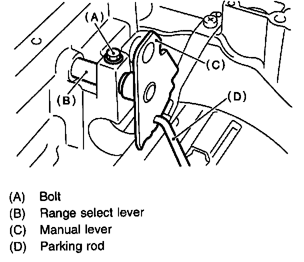 13) Remove bolts securing select lever, then remove select lever, manual lever and parking rod.