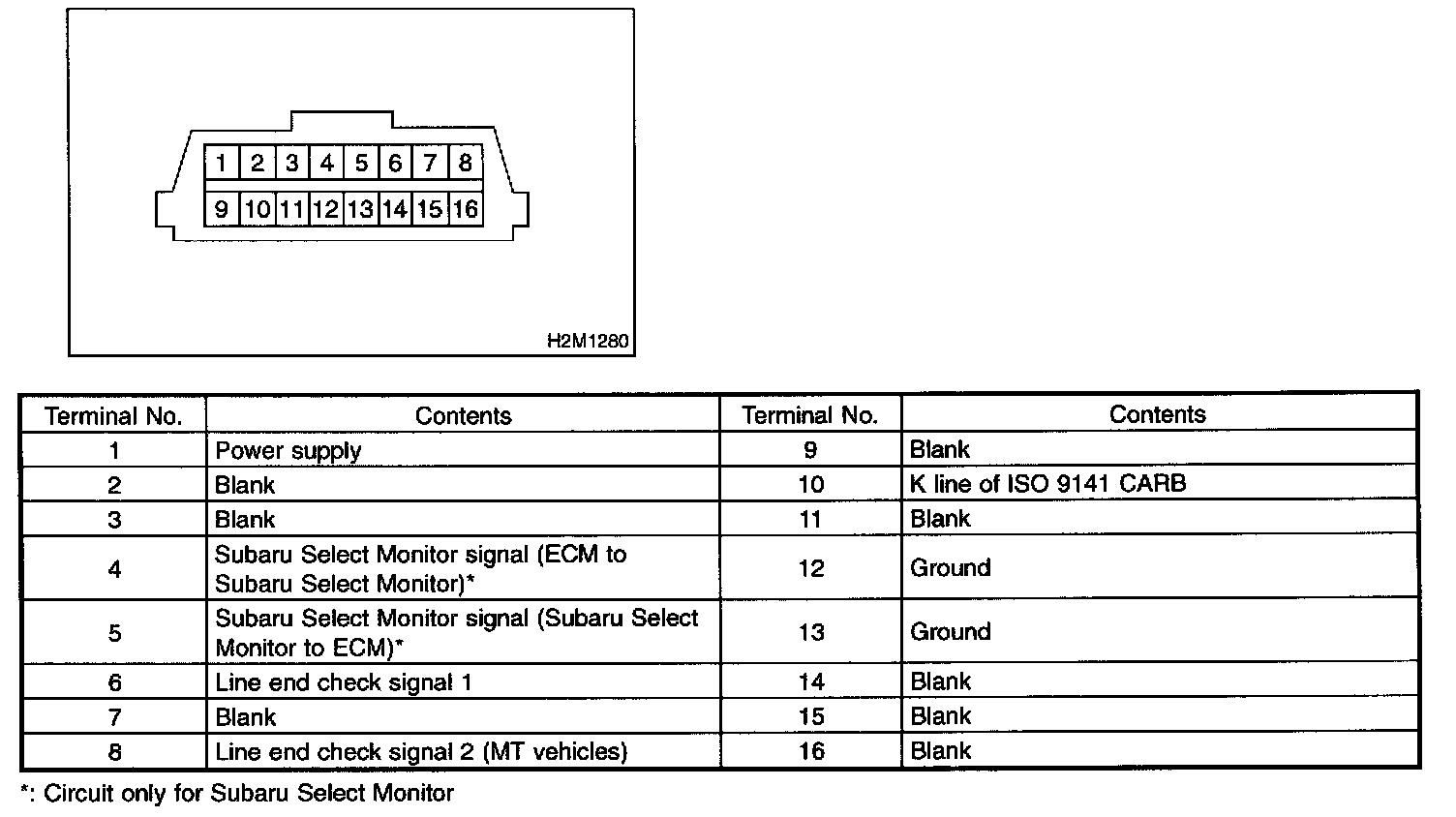 NOTE:1. This connector is used both for OBD-II general scan tools and the Subaru Select Monitor.