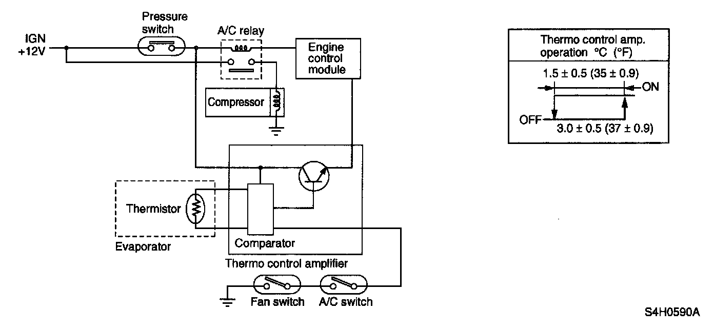 The thermo control amplifier disconnects the magnet clutch circuit to prevent the evaporator from becoming frosted when the temperature of the evaporator fin drops close to 3 °C (37 °F). When the limit temperature is reached, the thermistor (located on the evaporator fin) interrupts the base current of the amplifier. This deactivates the A/C relay, which in turn disconnects the magnet clutch circuit.
