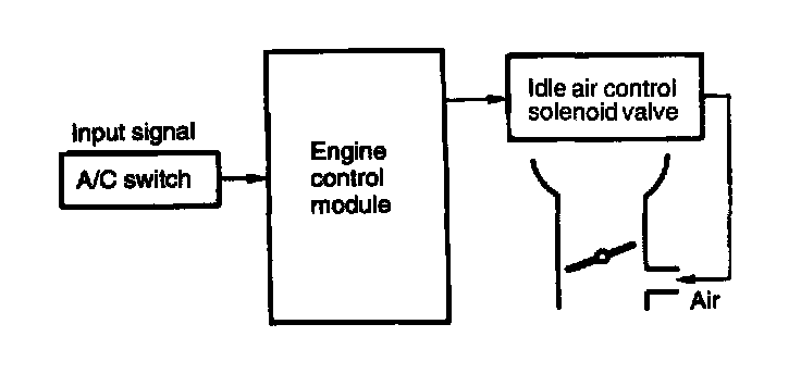The engine control module activates the idle air control solenoid valve when it receives an A/C switch ON signal so that necessary by-pass air is introduced into the throttle body to ensure proper idling speed for an increased engine load.
