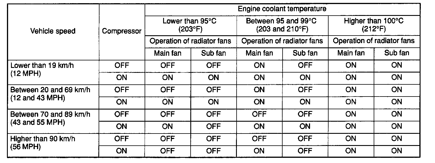 The main fan and sub fan are switched ON and OFF according to the operating modes as shown in the table.