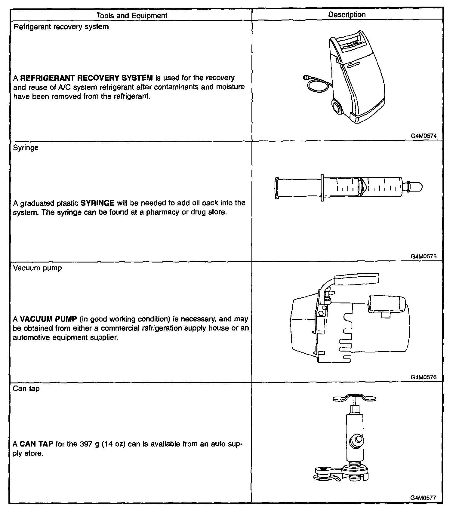 In order to help prevent mixing HFC-134a and CFC-12 parts and liquid, the tool and screw type and the type of service valves used are different. The gas leak detectors for the HFC134a and CFC-12 systems must also not be interchanged.