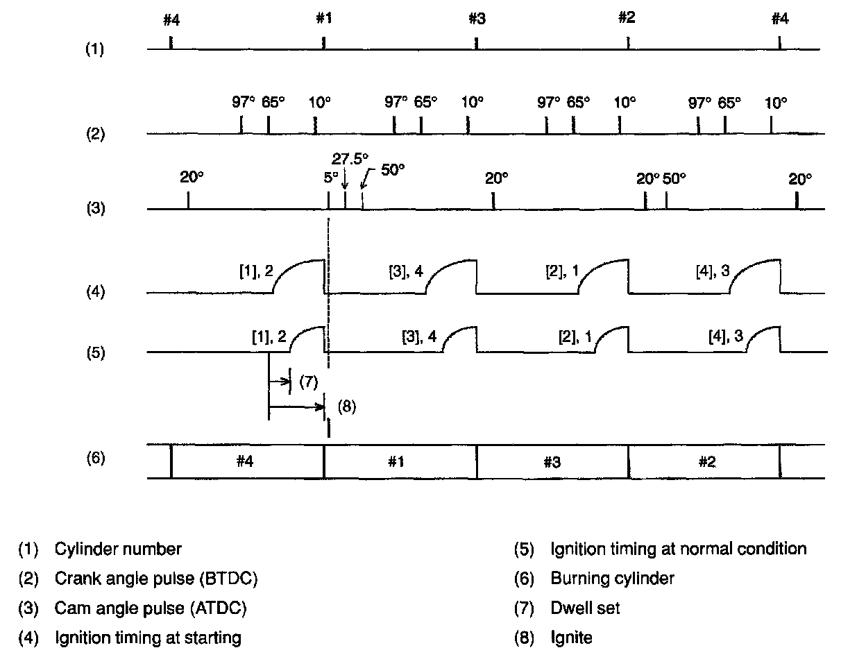 Between the 97° and 65° crank angle signal, the ECM measures the engine speed, and by using this data it decides the dwell set timing and ignition timing according to the engine condition.