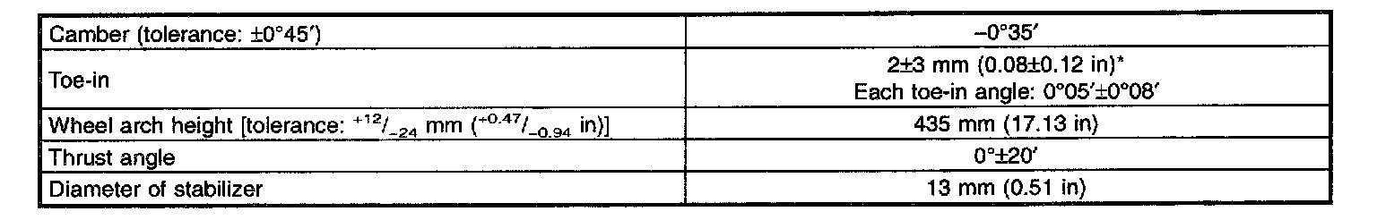 ^ Front and rear toe-ins and front camber can be adjusted. If toe-in or camber tolerance exceeds specifications, adjust toe-in and camber to the middle value of specification.