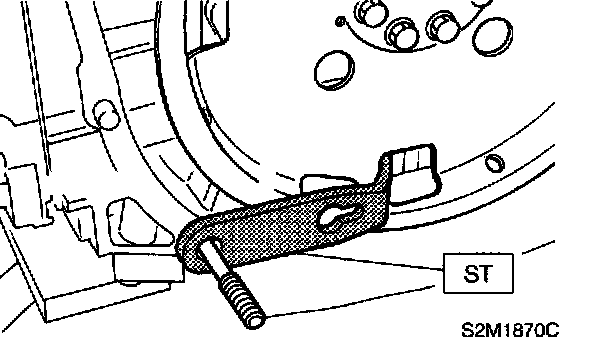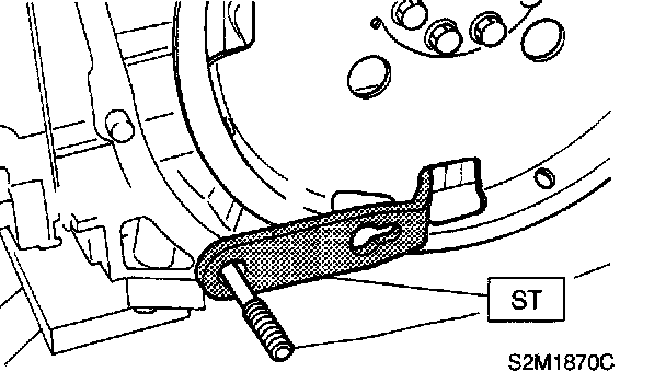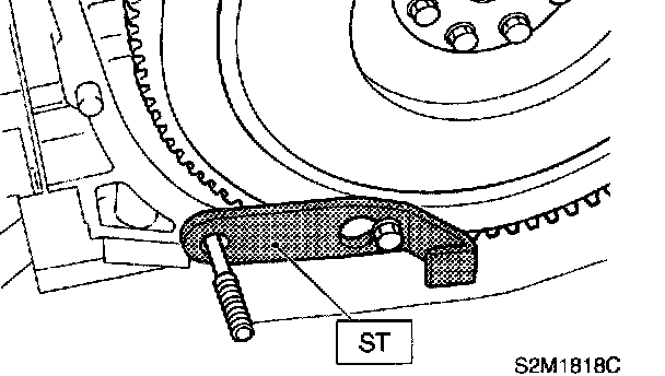 16) Remove flywheel (MT vehicles only) or drive plate (AT vehicles only). Using ST, lock crankshaft. ST 498497100 CRANKSHAFT STOPPER