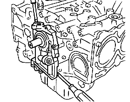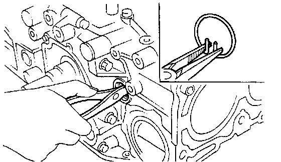 28) Remove oil pump from cylinder block. Use a flat-bladed screwdriver as shown in figure when removing oil pump.