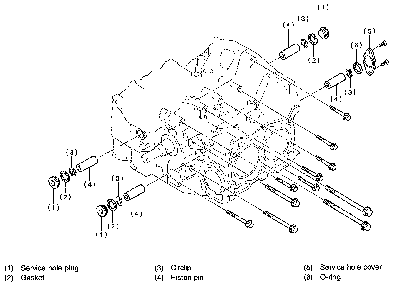 30) Rotate crankshaft to bring #1 and #2 pistons to bottom dead center position, then remove piston circlip through service hole of #1 and #2 cylinders.