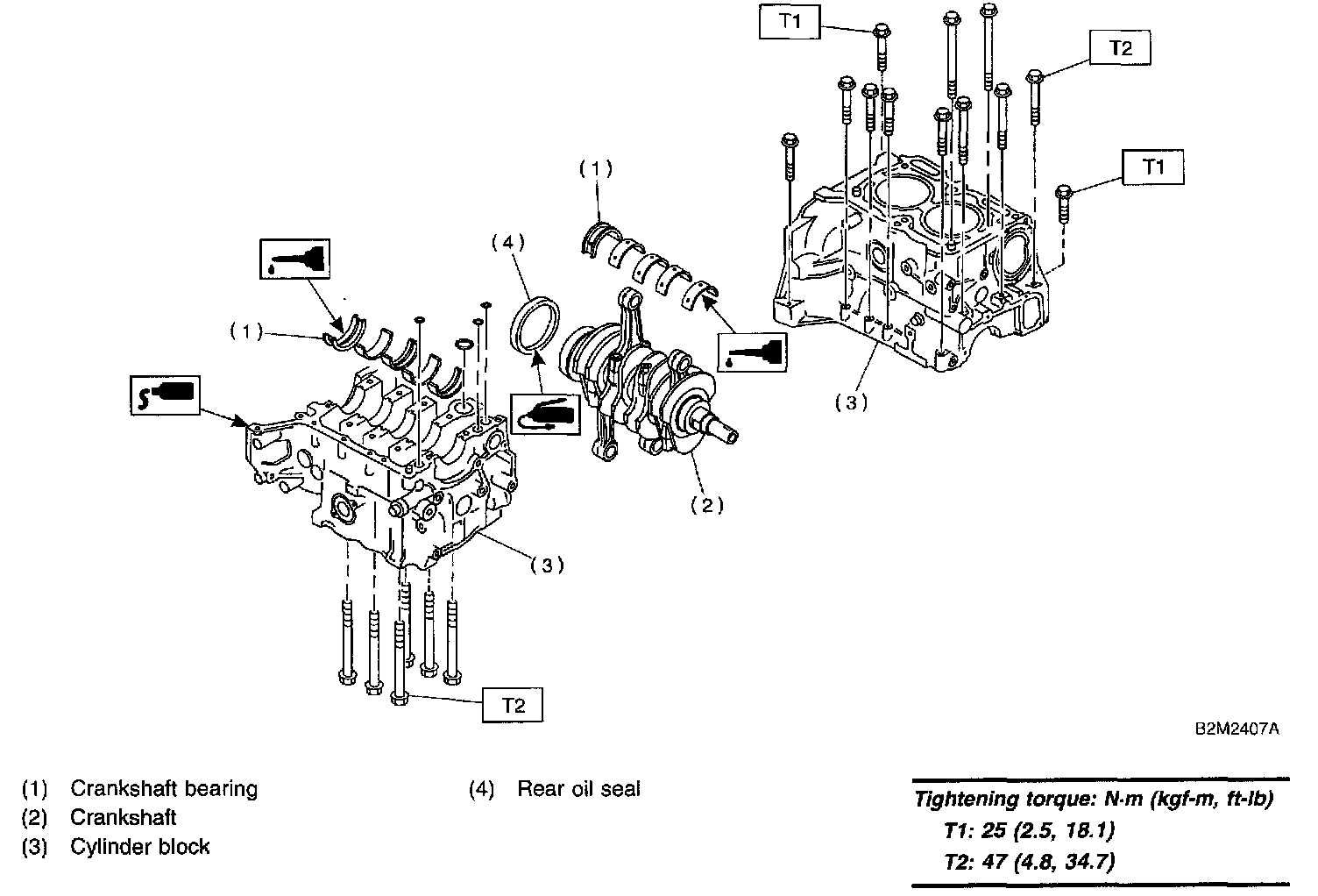 CAUTION: Remove oil in the mating surface of bearing and cylinder block before installation. Also apply a coat of engine oil to crankshaft pins.