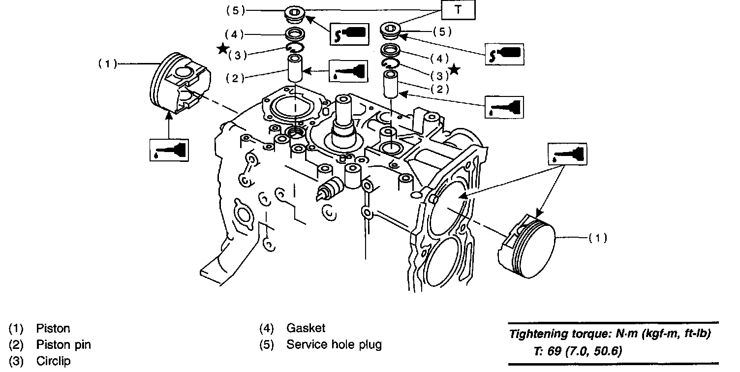 b. Apply a coat of engine oil to piston pin and insert piston pin into piston and connecting rod through service hole.