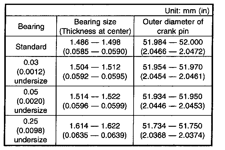 e) Measure the oil clearance on individual connecting rod bearings by means of plastigauge. If any oil clearance is not within specification, replace the defective bearing with a new one of standard size or undersize as necessary. (See the table below.)