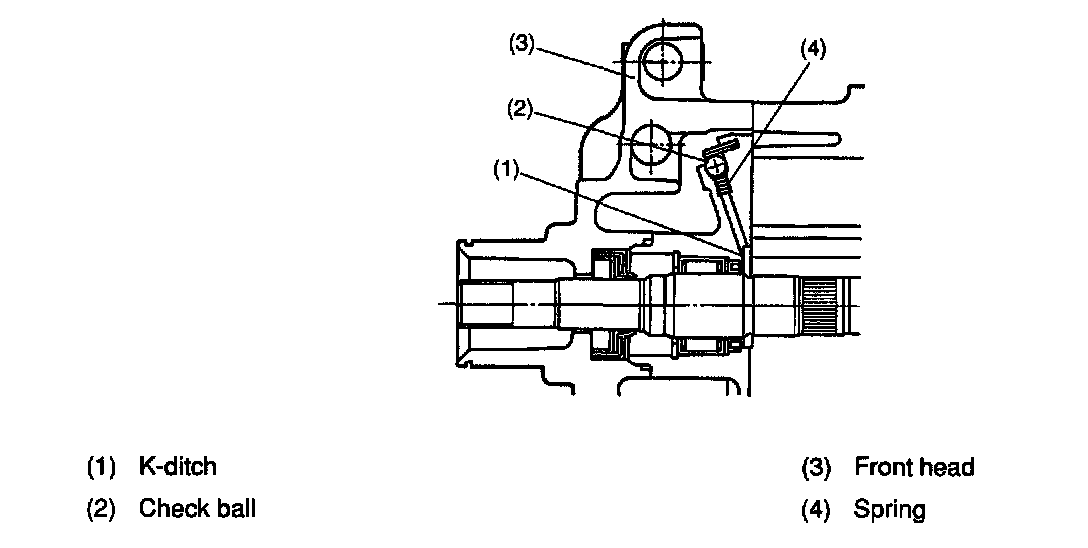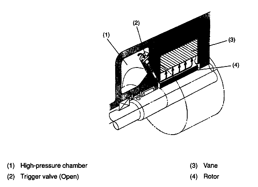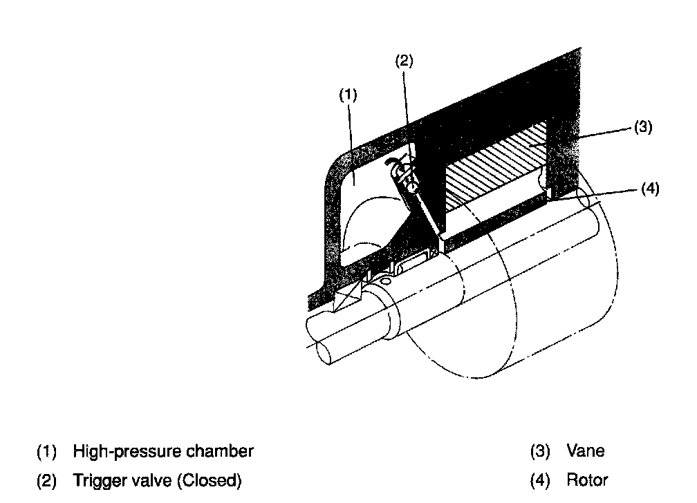 This valve has a function of maintaining a proper level of pressure behind the vanes (vane back pressure) such that they can move easily upon start of the compressor. The trigger valve is incorporated in the front side block and its end opens to a cavity called "K-ditch" that is provided in the rotor side end of the side block. The valve consists of a check ball and a spring.