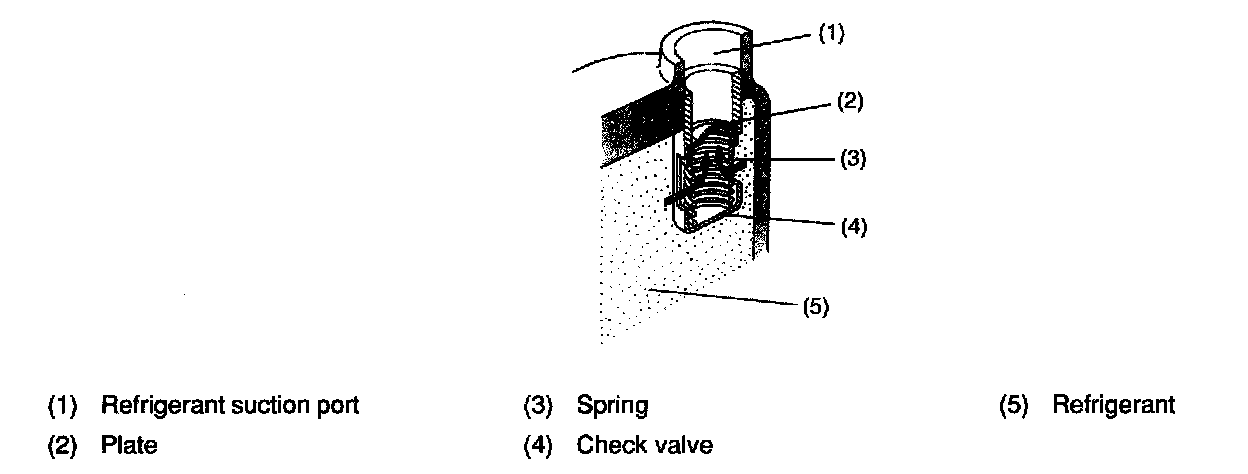 A check valve consisting of a spherical plate and spring is provided at the suction port of the rear head. Immediately after the compressor has stopped, there is large difference between the high and low-pressures. This would cause reverse rotation of the compressor and consequent reverse flow of refrigerant to the evaporator if no check valve is provided. Immediately after the compressor has stopped, the high-pressure refrigerant forces the check valve plate upward and closes the suction port to prevent flow of refrigerant from the high-pressure side to the low-pressure side.