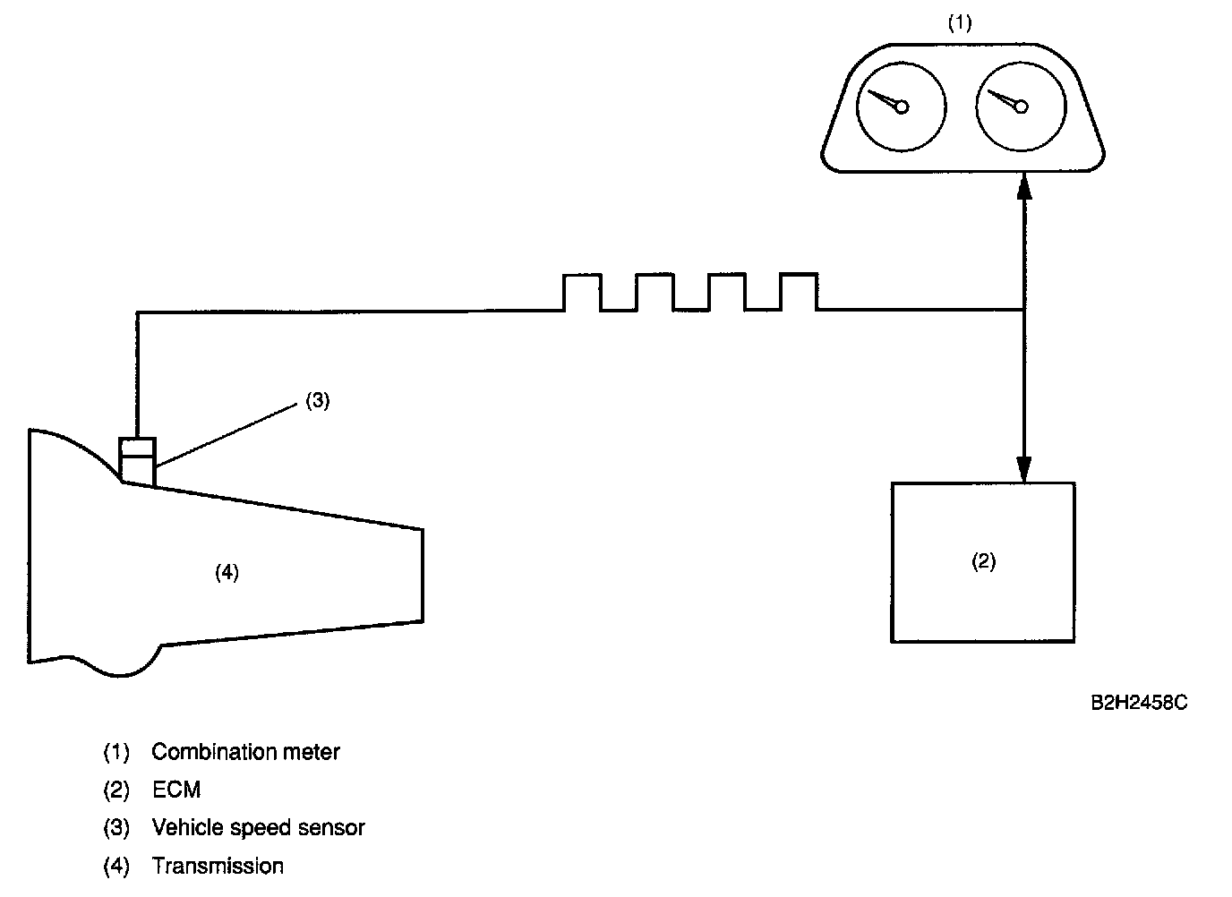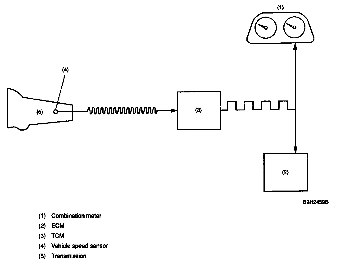 The vehicle speed sensor generates a 16-pulse signal for every rotation of the front differential and send it to the transmission control module (TCM). The signal sent to the TCM is converted there into a 4-pulse signal, and then sent to the ECM and the combination meter.