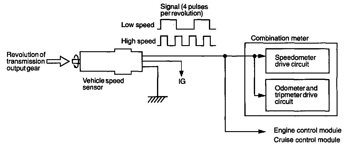 The Hall IC generates a signal that corresponds to a change in the magnetic field. One turn of the driven key in the speed sensor sends 4 pulses to the combination meter, engine control module and cruise control module.