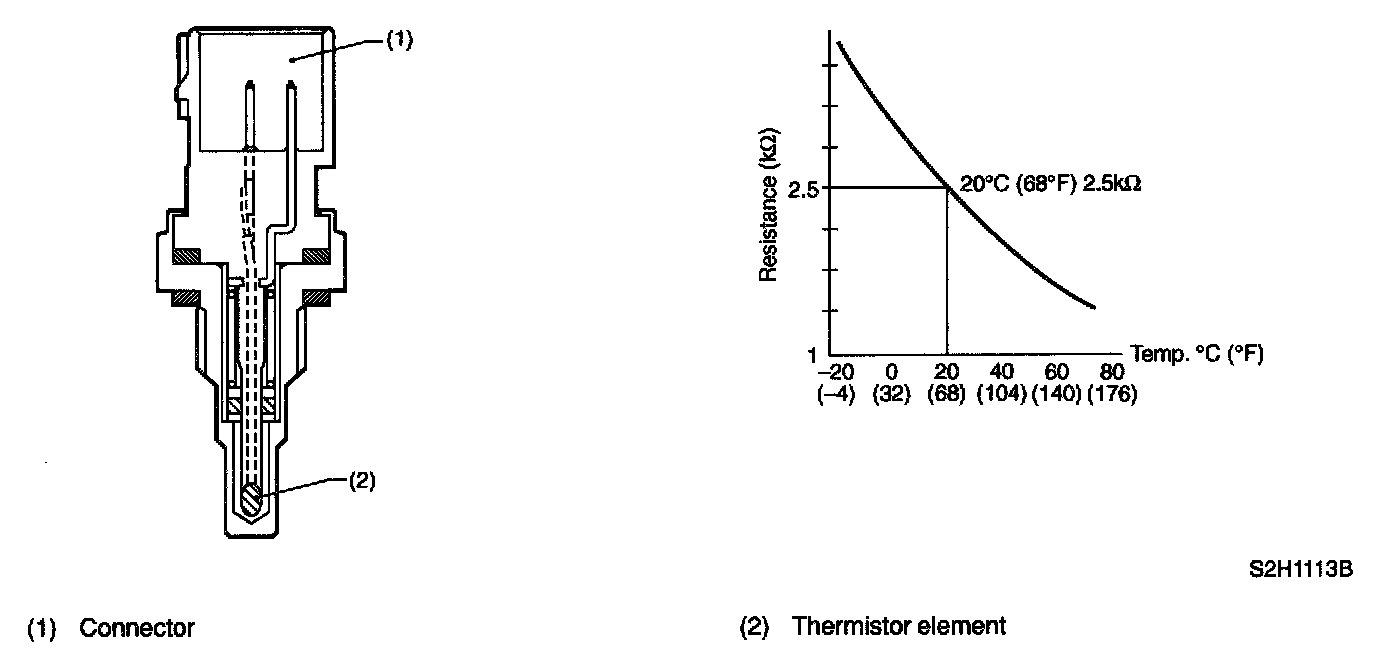 The engine coolant temperature sensor is located on the engine coolant pipe. The sensor uses a thermistor whose resistance changes inversely with temperature. Resistance signals as engine coolant temperature information are transmitted to the ECM to make fuel injection, ignition timing, purge control solenoid valve and other controls.