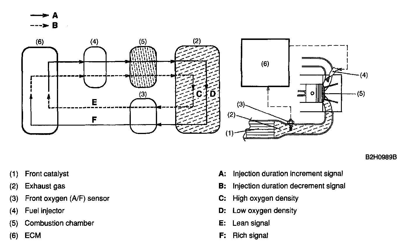 - In the air-fuel ratio feedback control, the ECM calculates the necessary amount of correction based on data from the oxygen sensor and adds the result to the basic duration (which is stored in the ECM's memory for each condition defined by the engine speed and various loads.)