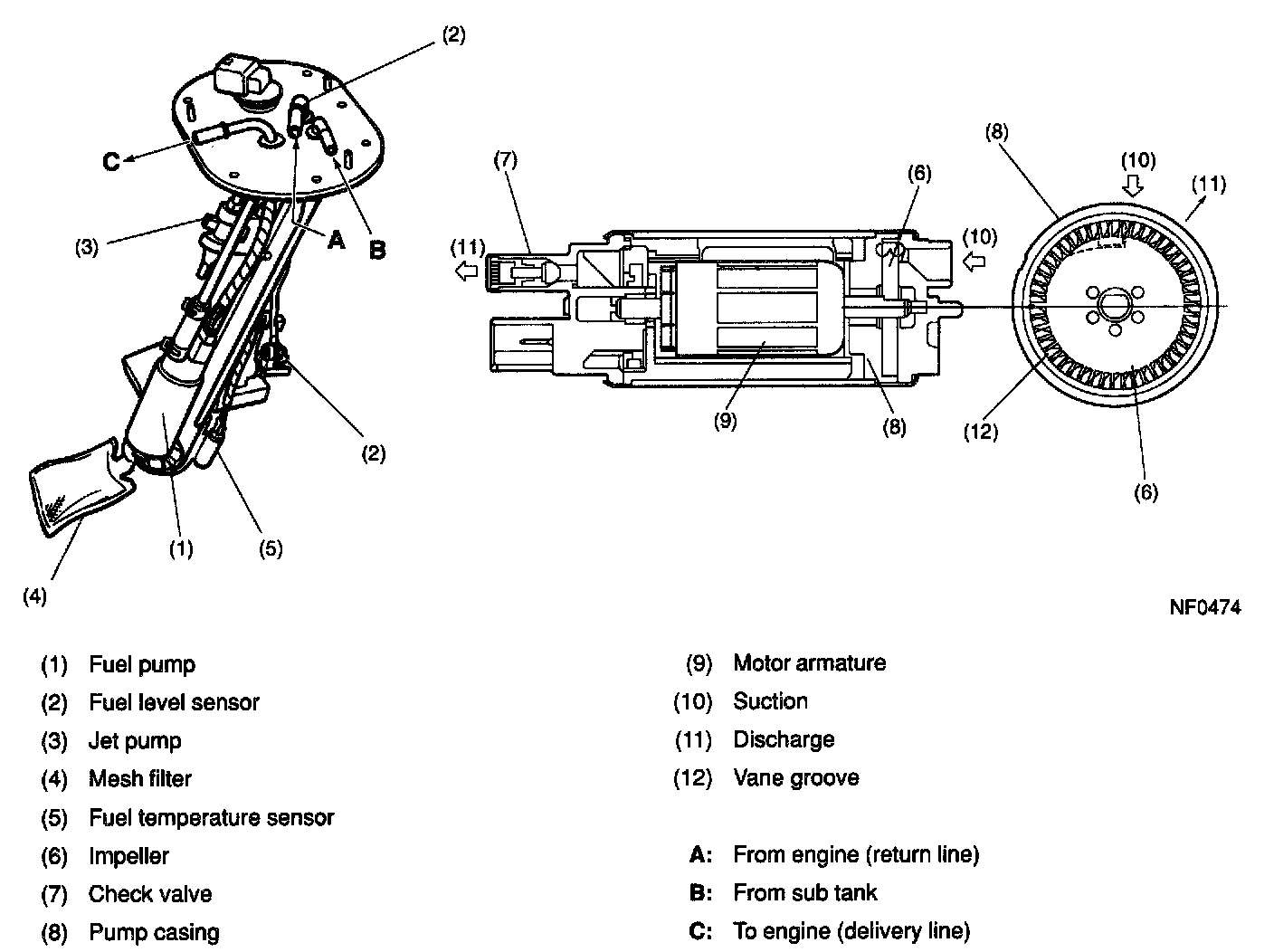- When the ignition switch is turned ON, fuel pump relay is activated. Then the motor operates to rotate the impeller.