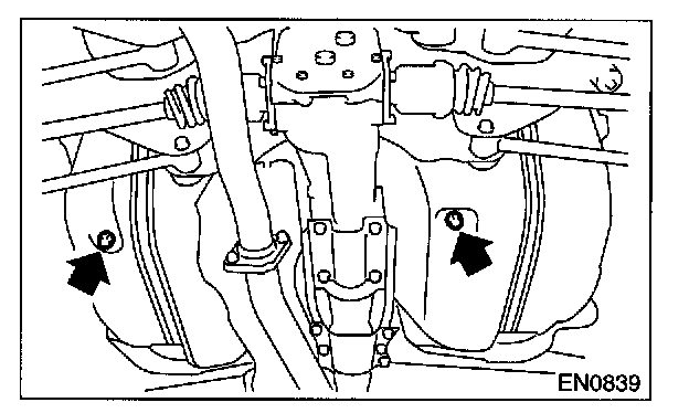 3. Drain the fuel from the fuel tank. Set a container under the vehicle and remove the drain plug from the fuel tank.