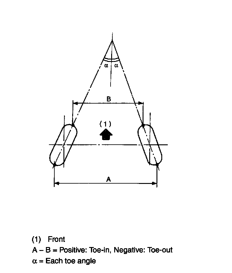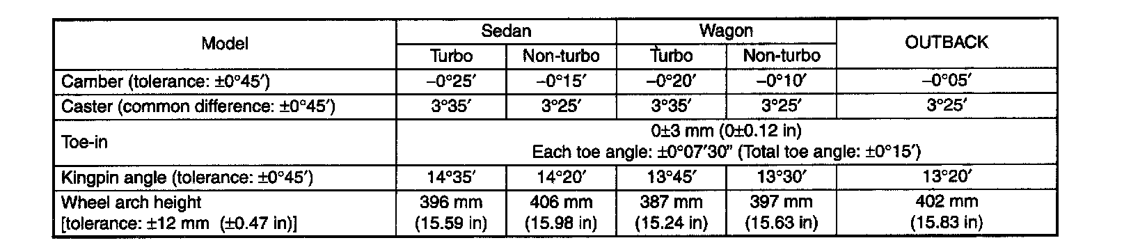 ^ Front and rear toe-ins and front camber can be adjusted. If the toe-in or camber tolerance exceeds specifications, adjust toe-in and camber to the middle value of specification.