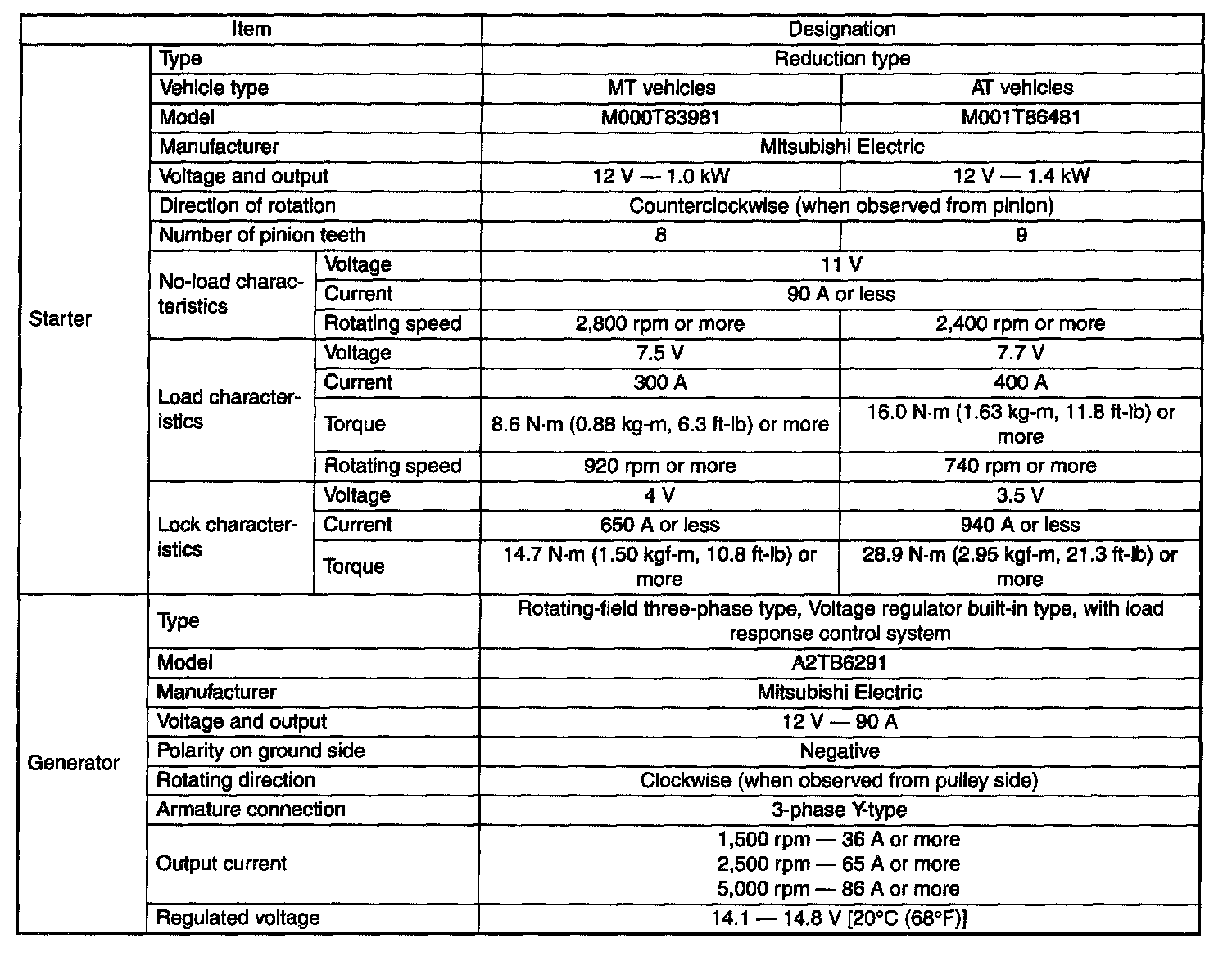 Starting and Charging: Specifications
