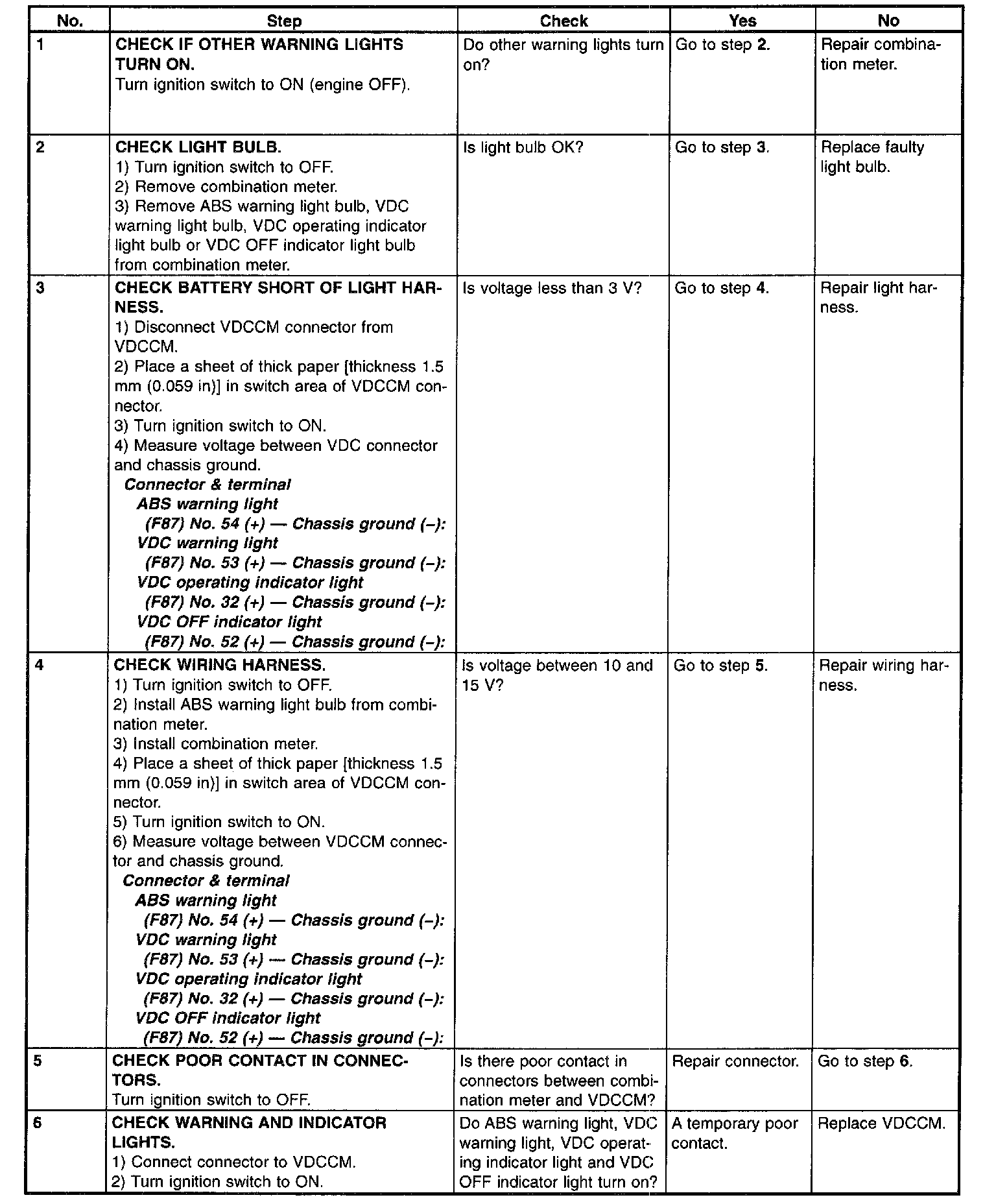 ABS WARNING LIGHT, VDC WARNING LIGHT, VDC OPERATING INDICATOR LIGHT OR VDC OFF INDICATOR LIGHT DOES NOT COME ON.DIAGNOSIS: