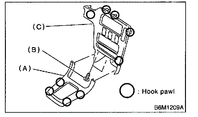 3. Remove screws (B) and then detach center panel (C) while disconnecting connector.