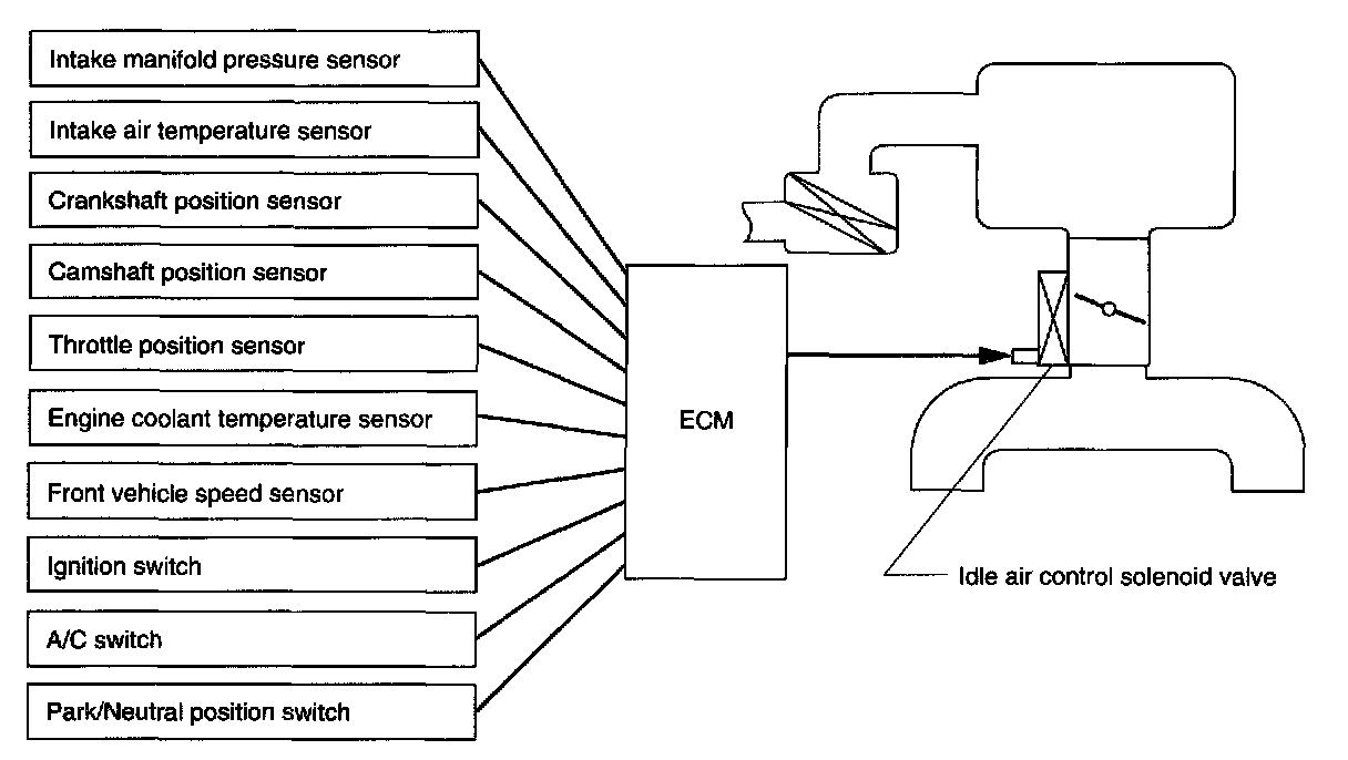 - The ECM activates the idle air control solenoid valve to control the bypass air flowing through the bypass passage in the throttle body depending on signals from the crankshaft position sensor, engine coolant temperature sensor, pressure sensor and A/C switch so that the proper idle speed for each engine load is achieved.