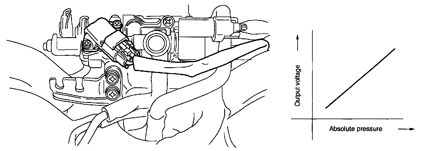 The intake manifold pressure sensor is attached to the top of the throttle body, and continuously sends to the engine control module (ECM) voltage signals that are proportional to intake manifold absolute pressures. The ECM controls the fuel injection and ignition timing based on the intake manifold absolute pressure signals in addition to other signals from many sensors and other control modules.