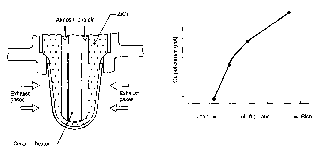 - When a lean air-fuel mixture is burnt in the cylinder, relatively large amount of oxygen remains in the exhaust gases even after the catalytic action, and this results in a small difference in the oxygen ion concentration between the tube's internal and external surfaces. The electromotive force in this case is very small.