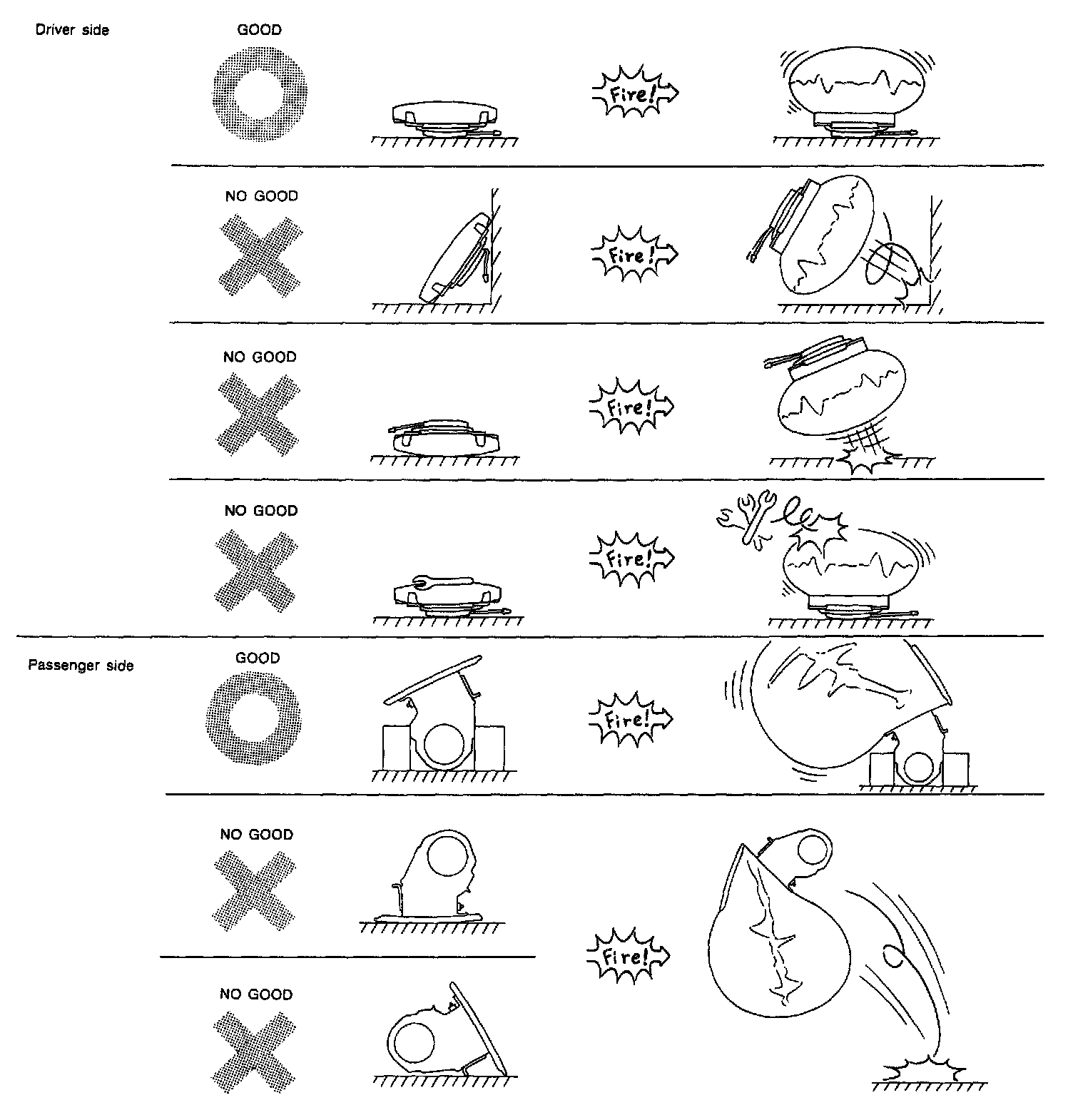 When storing a removed airbag module, do not place any objects on it or pile airbag modules on top of each other. If the airbag inflates for some reason when it is placed with its pad side facing downward or under any object, a serious accident may result.