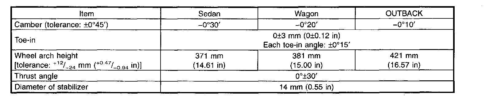 ^ The other items indicated in the specification table cannot be adjusted. If the other items exceeds specifications, check suspension parts and connections for deformities; replace with new ones as required.