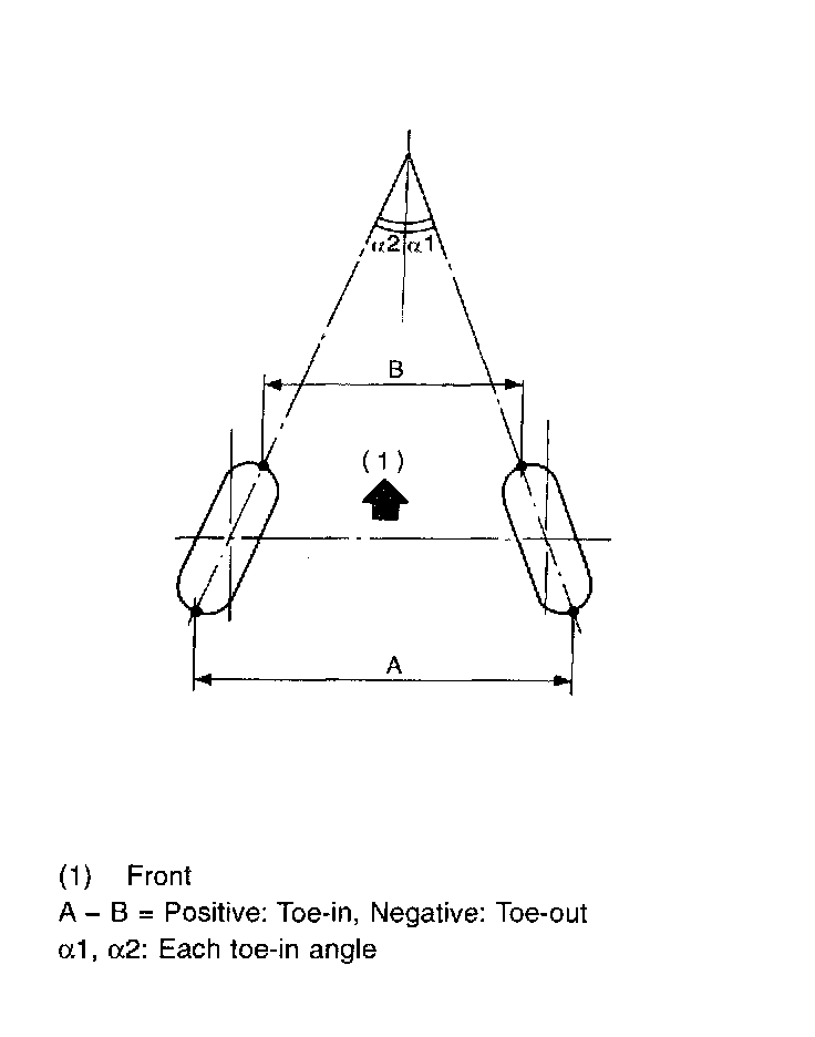 ^ Front and rear toe-ins and front camber can be adjusted. If toe-in or camber tolerance exceeds specifications, adjust toe-in and camber to the middle value of specification.