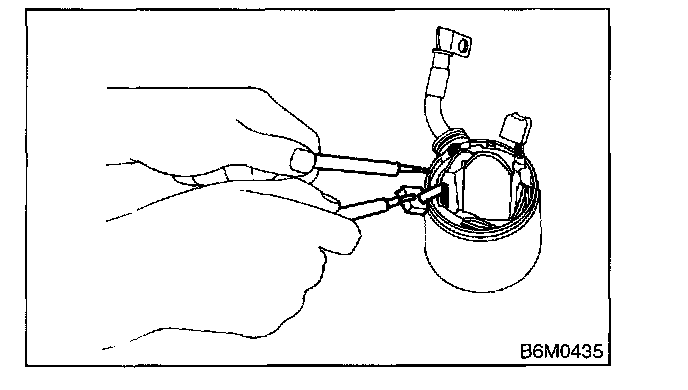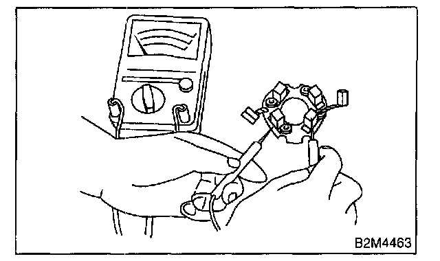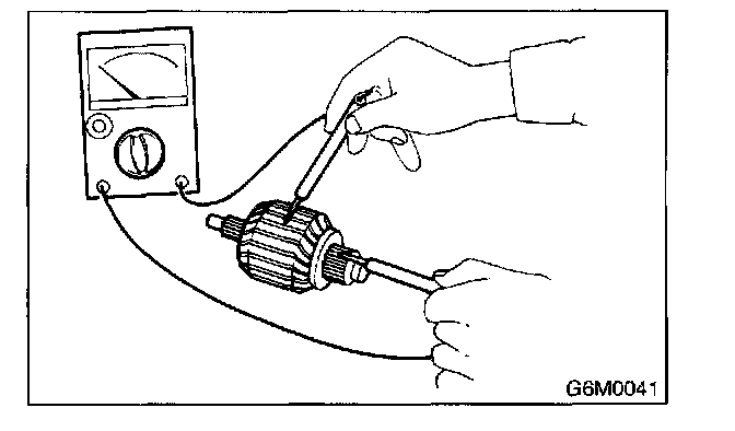 Using circuit tester, touch one probe to the commutator segment and the other to shaft. There should be resistance of 1 MOhm or more. If resistance is 1 Ohm or less, armature is grounded. Replace armature if it is grounded.