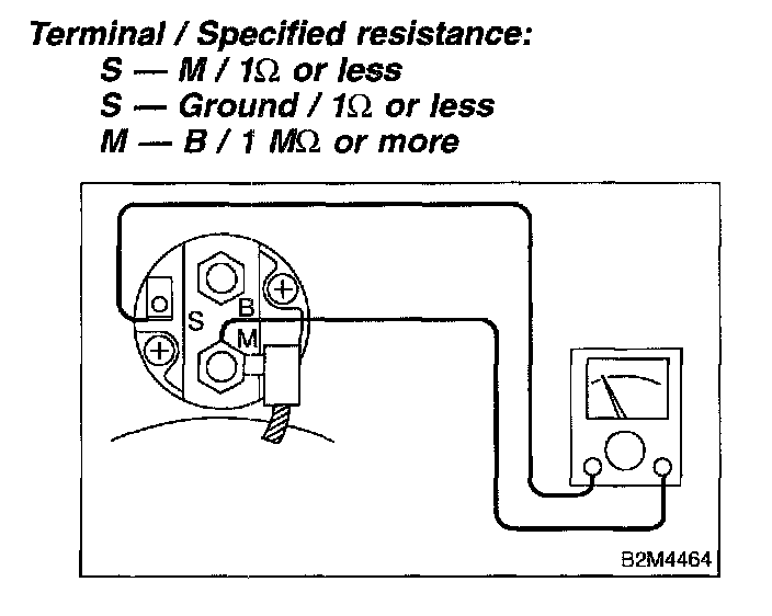 Be sure there is resistance of 1 Ohm or less between terminals S and M, and between terminal S and ground. Use a circuit tester (set in "ohm"). Also check to be sure resistance is 1 MOhm or more between terminal M and B.