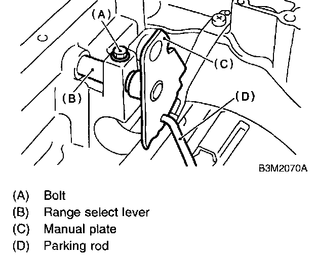 11. Remove bolts securing select lever, then remove select lever, manual plate and parking rod.