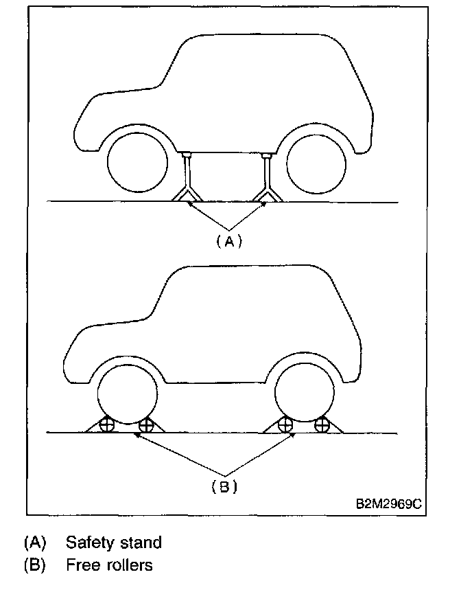 - In order to prevent the vehicle from slipping due to vibration, do not place any wooden blocks or similar items between the safety stands and the vehicle.