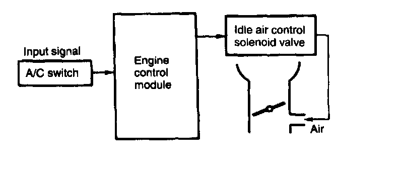 The engine control module activates the idle air control solenoid valve when it receives an A/C switch ON signal so that necessary by-pass air is introduced into the throttle body to ensure proper idling speed for an increased engine load.