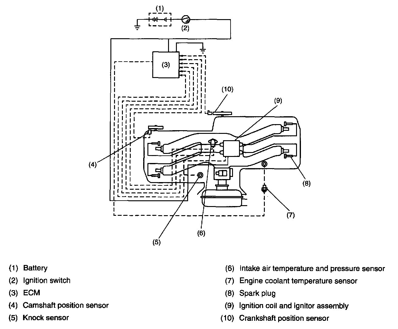 The ECM monitors the operating condition of the engine using the signals from the sensors and switches shown above and determines the ignition timing most appropriate for each engine operating condition. Then it sends a signal to the ignitor, commanding generation of a spark at that timing.