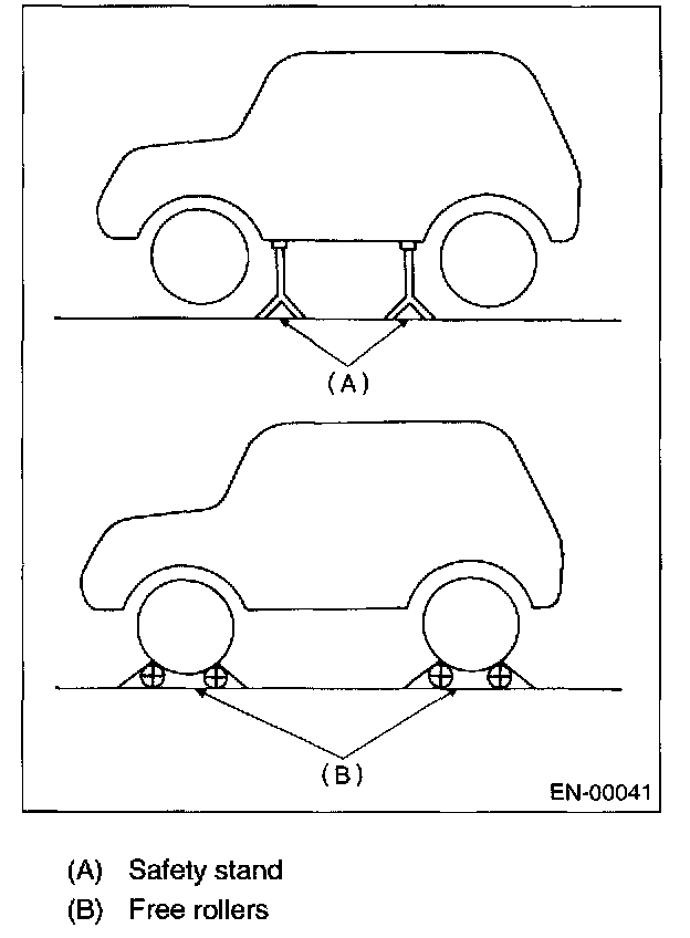 - In order to prevent the vehicle from slipping due to vibration, do not place any wooden blocks or similar items between the safety stands and the vehicle.